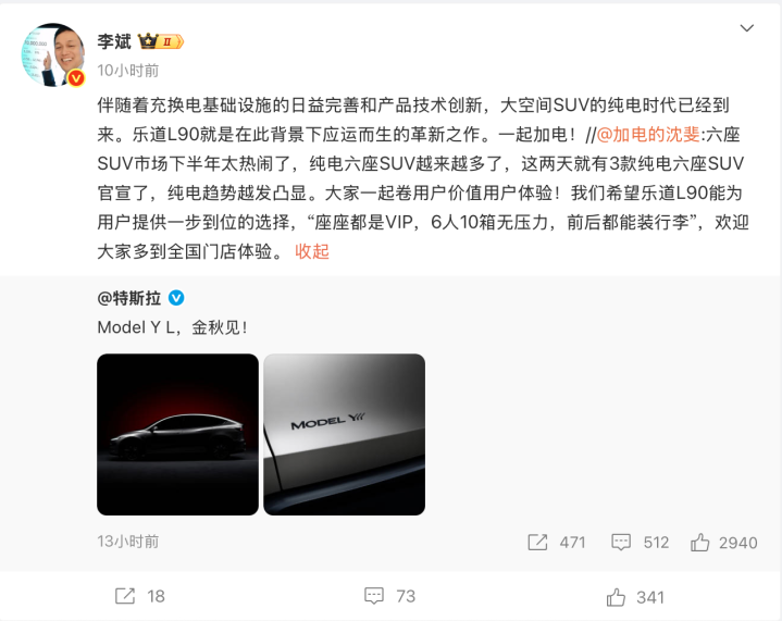 7月16日晚,特斯拉官微发文称,“ModelYL,金秋见”。理想汽车CEO李想转发并表示,“值得尊重的六座纯电SUV来了,关注20-30万价位的六座纯电SUV用户可以期待一下。当然如果用车需求是5座,欢迎关注9月发布的理想i6。”
