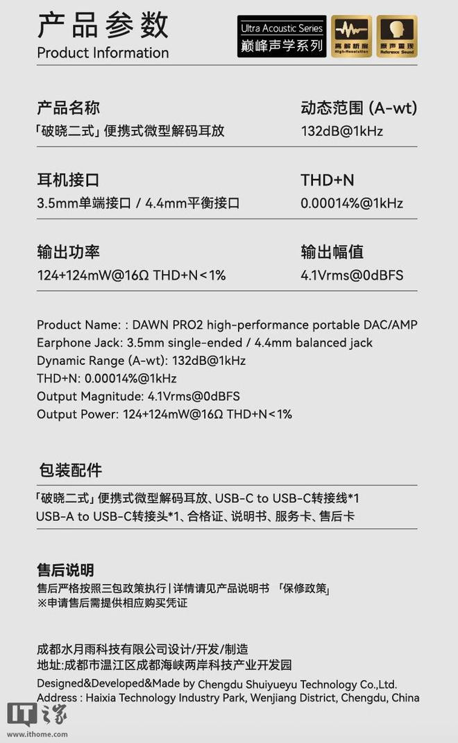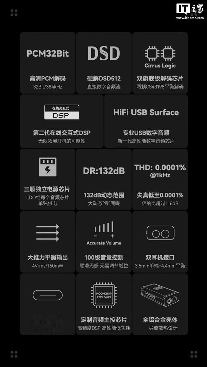 该耳放内置两颗CS43198芯片,支持硬件解码播放16Bit/44.1kHz到32Bit/384kHz的PCM音源,提供132dB动态范围和132dB真实信噪比,用户同时可以搭配水月雨App调参。