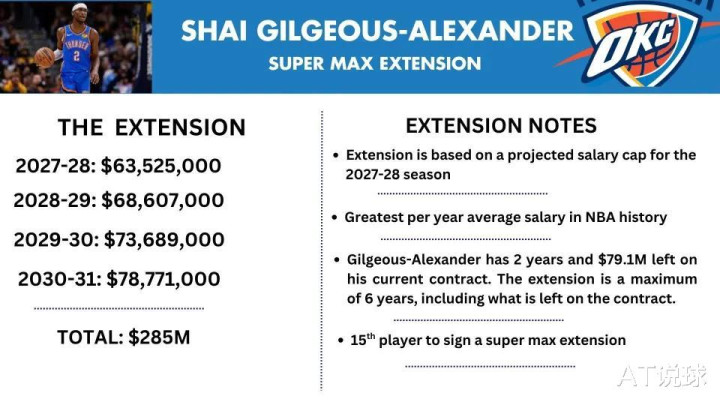 NBA球员的薪资合同在16年发生改变,随着转播合同的提高,球员的身价也水涨船高,普通球员动不动就能够拿到一个两三千万的年薪,超级球星更是5000万起步。前几年利拉德布朗和塔图姆更是拿到了6000万左右的年薪,当时就已经引发了巨大的热议,没想到亚历山大这一次续约居然平均年薪高达7000多万,最后一年的合同更是将近8000万,几乎刷新了各大体育联盟的薪资记录。