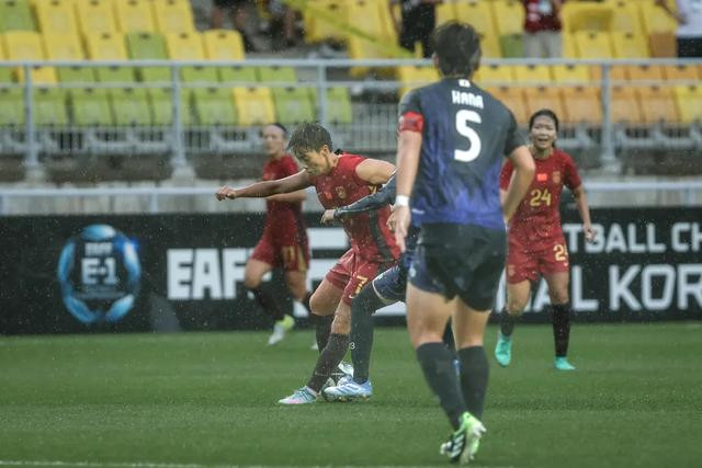 对日本的比赛是在大雨中进行的,中国女足踢得十分强硬。