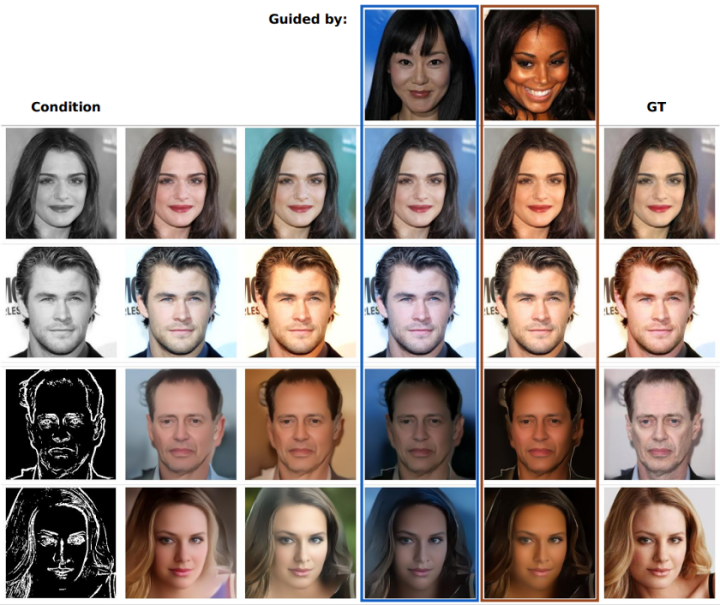 Conditional-DDNs做上色和边缘转RGB任务。第四、五列展示了以其它图像为引导的情况下,零样本条件生成的效果,生成的图像会在保证符合condition的情况下尽可能靠近guided图像的色调。