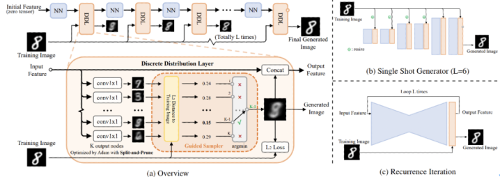 在图(a)中,把生成相关的设计整合为DiscreteDistributionLayer(DDL),把仅提供基础计算的模块封装为了NNBlock,并重点展示训练时DDL内部的数据流。主要关注以下几点: