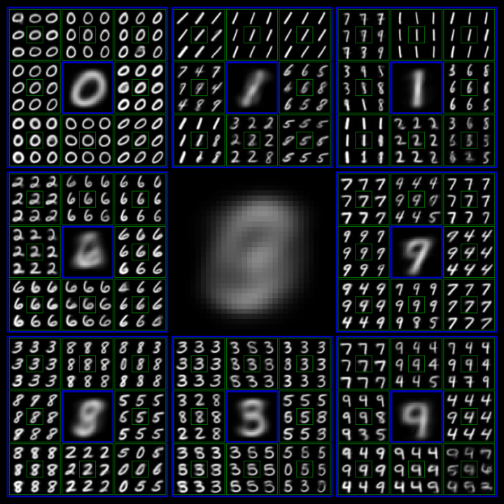 为了可视化latent的结构,我们在MNIST上训练了一个outputlevel层数L=3,每一层outputnodes数目K=8的DDN,并以递归九宫格的形式来展示其latent的树形结构。九宫格的中心格子就是condition,即上一层被采样到的output,相邻的8个格子都代表基于中心格子为condition生成的8个新outputs。