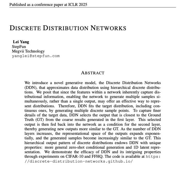 本项工作提出了一种全新的生成模型:离散分布网络(DiscreteDistributionNetworks),简称DDN。相关论文已发表于ICLR2025。